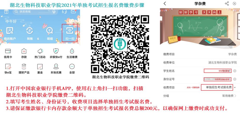 六、关于缴费方式,此次单招考试收取报名考试费200元/生,全部实行网上缴费,可下载农业银行APP,扫描湖北生物科技职业学院缴费二维码(二维码附后),填写考生姓名及身份证号,选择缴费项目(单独招生考试报名费),直接支付。也可代他人缴费,尽量在到校前一天完成缴费。