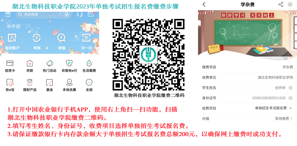 2.仅支持农业银行APP缴费,可用他人农业银行APP输入考生姓名及身份证号缴费。