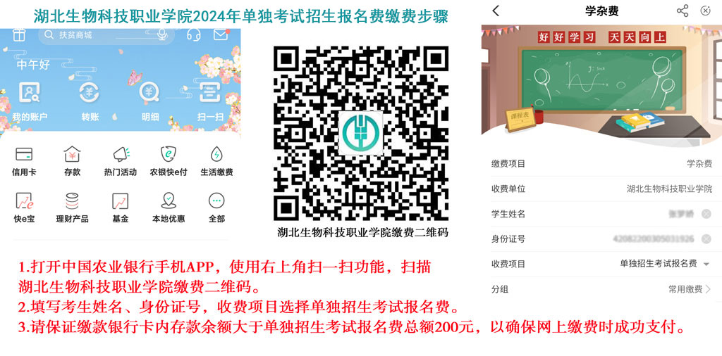 欢迎你报考湖北生物科技职业学院!为做好2024年高职单独考试招生工作,学校实行“网上自助”的缴费方式,请你在规定的时间内完成缴费。具体事项告知如下:
