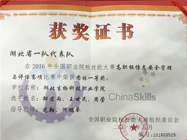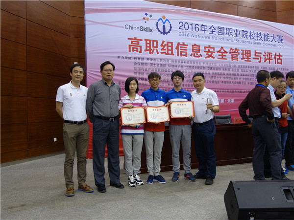 【鄂生科院网讯】2016职业教育活动周及全国职业院校技能大赛在天津举行,我校荣获全国职业技能大赛信息安全项一等奖。本次大赛是由教育部等20多个部委联合主办的全国性大赛,是全国覆盖面最广、含金量最高的赛事,每个参赛队经所在省份选拔后获取国赛资格。大赛以“弘扬工匠精神 打造技能强国”为主题,共设94个项目,参赛选手超过万人,经过激烈竞技,最终有75支参赛队进入总决赛。