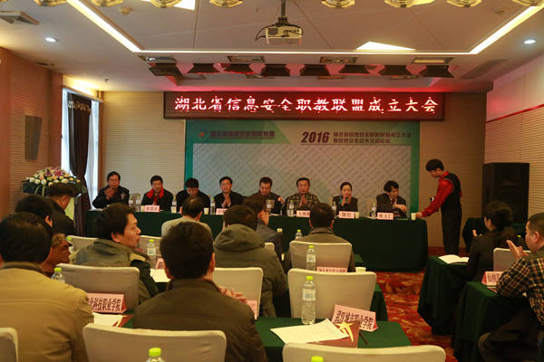 2016110,由湖北生物科技职业学院与神州数码网络(北京)有限公司共同承办的湖北省信息安全职教联盟成立大会在武汉隆重召开。出席本次大会的主要领导有全国高等院校计算机基础教育研究会高职高专专业委员会秘书长盛鸿宇,湖北日报社新媒体集团大数据中心主任、湖北省委省政府高级舆情分析师傅文仁,湖北省信息技术教学指导委员会主任王路群,湖北省教育厅教科院刘群,湖北生物科技职业学院党委书记、校长田曙曦,湖北生物科技职业学院副校长鲁性贵,湖北青年职业学院党委书记张红,仙桃职业学院副校长徐国洪等。参加本次大会的本科院校2所,高职院校27所,中职院校6所,信息安全行业企业9家。湖北日报、湖北广播电视台、荆楚网等媒体单位给予本次大会大力支持。参会总人数达120余人。